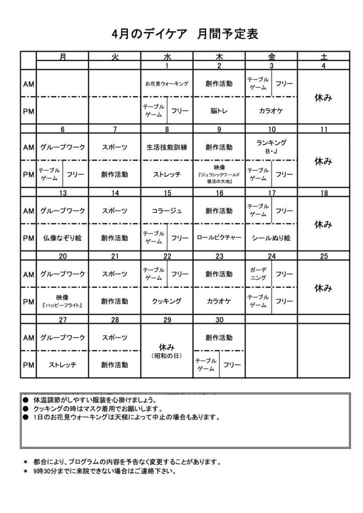 2026年4月のデイケア予定表を掲載しました! 2026.04.03 デイケア 2026年4月のデイケア予定表を掲載しました! 4月度、5月度土曜日医師勤務について 前の記事 2026年07月03日 川合医師休診のお知らせ 次の記事